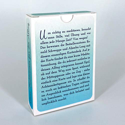 Das beweisen die Bestsellerautoren Ronald Schweppe und Aljoscha Long mit diesem einmaligen Kartendeck. Jede Karte enthält eine kurze Meditationsübung, die man jederzeit mühelos in seinen Alltag integrieren kann. Egal, ob auf dem Weg zum Sport, während der Mittagspause oder im Zug – einfach eine Karte ziehen und eine kleine Achtsamkeitspause einlegen.